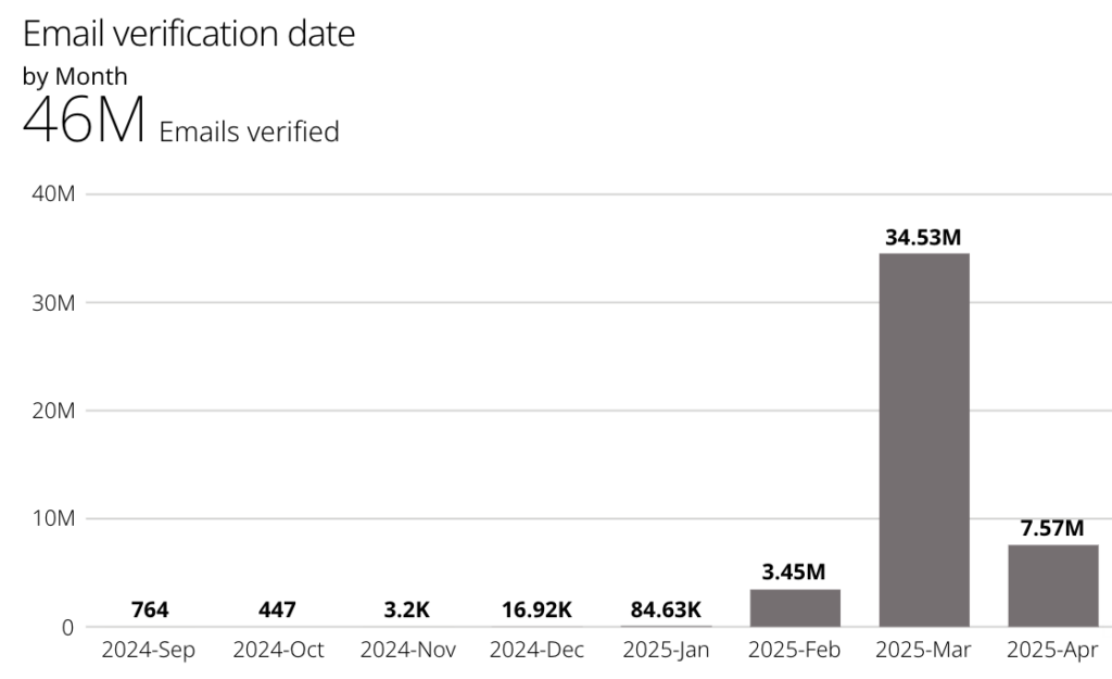 - 7 million new email addresses verified and added (RevenueBase total: 46M total verified email addresses.)
