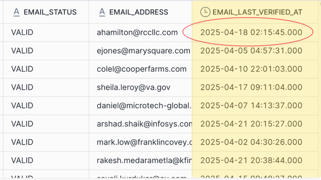- EMAIL_LAST_VERIFIED_AT Field: For transparency about data quality, RevenueBase now includes a timestamp indicating when the email address's deliverability was last verified.