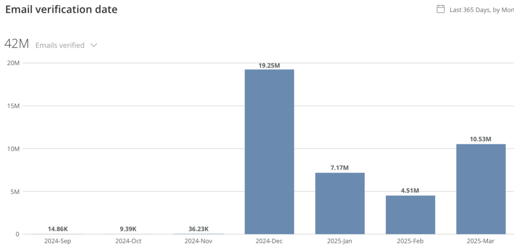 March updates included 24.4 million new contacts and 6.5 million verified emails, plus new features like monthly funding updates and last-verified timestamps. RevenueBase now tracks 174.7 million total contacts with enhanced transparency through real-time data freshness reporting.